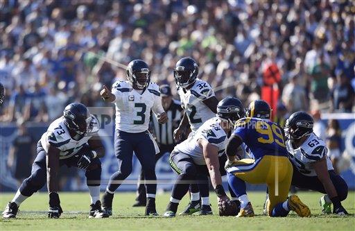 AP file photo: Versatile quarterback of the Seattle Seahawks Russell Wilson seen here against the Los Angeles Rams last Sunday Sep 18th, will be throwing against the San Francisco 49ers Sunday at Century Link Field in week three of the NFL season