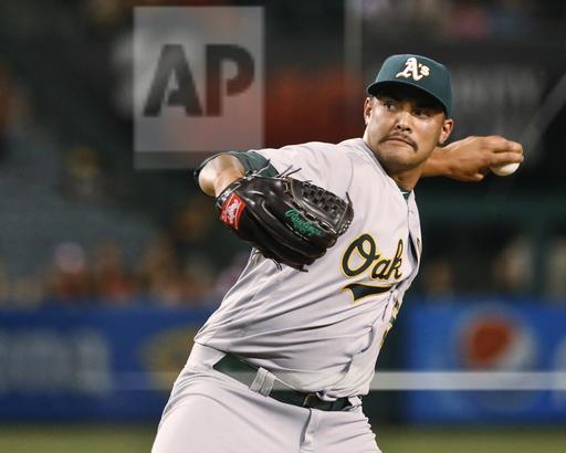 AP photo: Oakland A’s starter Sean Manaea pitches against the Los Angeles Angels in the first inning of Monday night’s game at the Big A in Anaheim