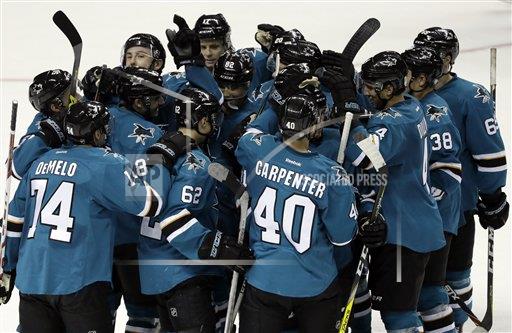 AP photo: San Jose Sharks Kevin Labanc (62) is mobbed by teammates following scoring a game winning overtime goal to beat the visiting Vancouver Canucks on Tuesday night at SAP Center in the first pre season game