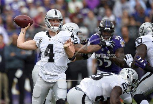 AP photo: Oakland Raiders quarterback Derek Carr (4) threw under pressure for most of Sunday to help the Raiders just get by the Baltimore Ravens