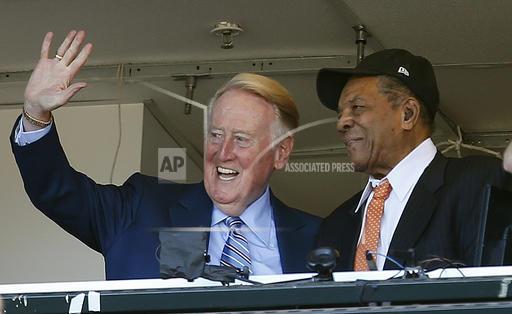 AP Photo: A photo for the ages Los Angeles Dodgers announcer Vin Scully (left) and former San Francisco Giant outfielder Willie Mays (right) wave to the crowd from the Dodgers radio booth on Scully’s last game calling baseball at AT&T Park in San Francisco on Sunday
