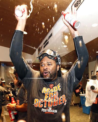 AP photo: San Francisco Giants pitcher Johnny Cueto raises his bottle of champagne and arms after the Giants clinched NL Wild Card second spot