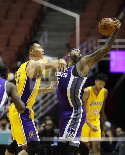 AP photo: The Los Angeles Lakers Yi Jianlian puts the pressure on the Sacramento Kings DeMarcus Cousins in the first half at the Honda Center on Tuesday night in NBA pre season action
