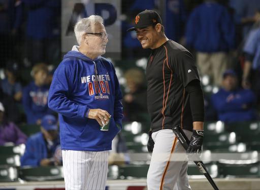 AP photo: Chicago Cubs manager Joe Maddon (left) and San Francisco Giant pitcher Matt Moore (right) converse prior to game one of the NLDS at Chicago’s Wrigley Field on Friday night