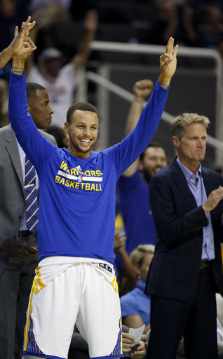 AP photo: Stephen Curry of the Golden State Warriors raises his hands in delight as head coach Steve Kerr (right) is thrilled with the Warriors play against the Sacramento Kings on at SAP Center on Thursday night