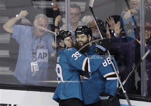 AP photo: San Jose Sharks Logan Courture (left) and Brett Burns (88) celebrate Burn’s third period goal against the Los Angeles Kings at SAP Center on Wednesday night