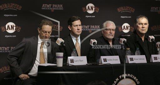 AP photo: San Francisco Giants brass Larry Baer team CEO, Bobby Evans Sr Vice president & general manager, Executive vice president Brian Sabean, and field manager Bruce Bochy address the media after announcing their hunt for a closer in the off season and the firing of base coaches Bill Hayes and Roberto Kelly