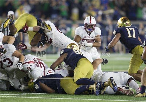 AP photo: The Stanford Cardinal running back Cameron Scarlett bursts for a first down against the Notre Dame Fighting Irish at Notre Dame Stadium in South Bend Indiana