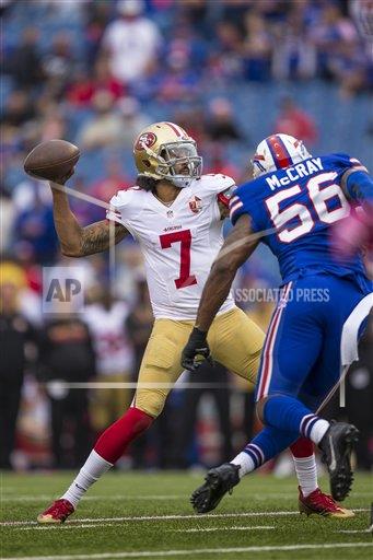 AP photo: San Francisco 49ers quarterback Colin Kaepernick prepares to let one fly under pressure against the Buffalo Bills last Sunday at Orchard Park NY