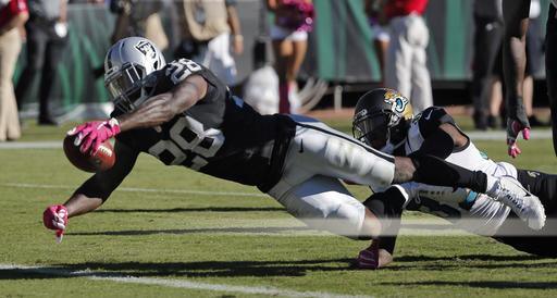 AP photo: Oakland Raiders running back Latavius Murray (28) takes a dive right into the end zone while he’s grabbed from behind by the Jacksonville Jaguars free safety Tashaun Gipson (39) just getting over the line for a fourth quarter touchdown in Jacksonville on Sunday