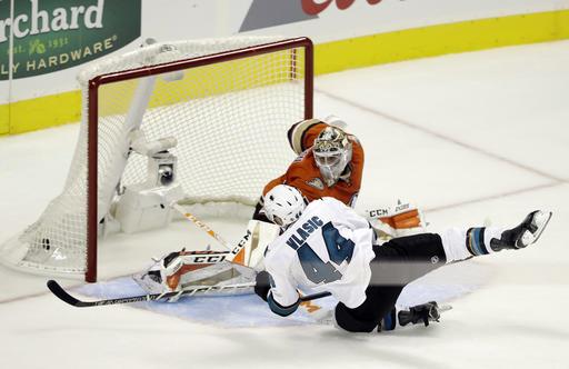 AP photo: San Jose Sharks Marc-Edouard Vlasic scores sliding on is left knee on Anaheim Ducks goaltender John Gibson on the glove side to break the deadlock for the OT game winner on Tuesday night at SAP Center