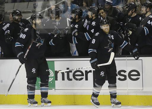 AP Photo: San Jose Sharks Joe Pavelski (8) and Brett Burns (88) take a victory skate in front of the Sharks bench after Pavelski’s goal in the second period against the Nashville Predators on Saturday night at SAP Center