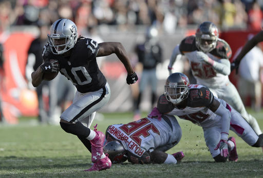 AP photo: Oakland Raiders wide receiver Seth Roberts (10) starts his run towards the end zone after a pass from Raider quarterback Derek Carr for a 41 yard overtime touchdown to beat the Tampa Bay Buccaneers at Raymond James Stadium in Tampa