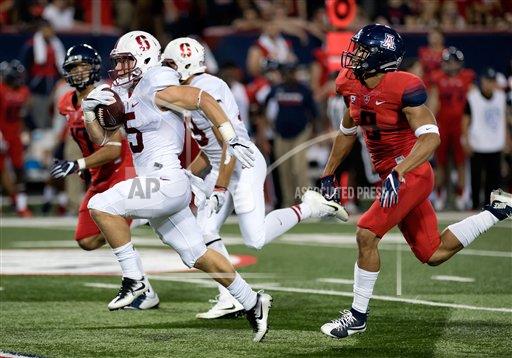AP photo: Stanford Cardinal running back Christian McCaffrey goes full bore from the field for his second touchdown against the Arizona Wildcats in the second quarter last Saturday night