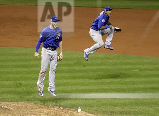 AP photo: Chicago Cubs Kris Bryant (left) and Addison Russell (right) leap in jubilation after the last out of game seven of the 2016 World Series against Cleveland at Progressive Field in Cleveland
