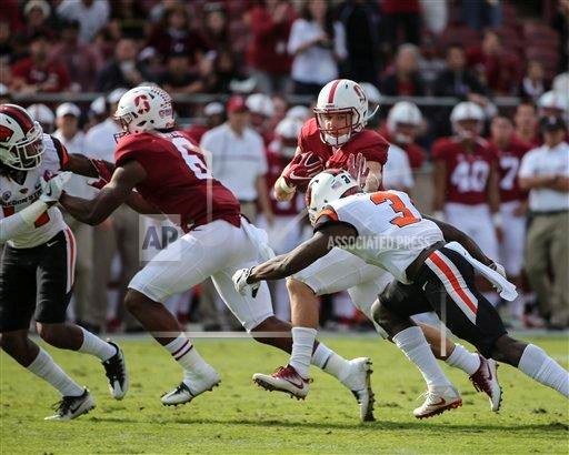 AP photo: Stanford running back Christian McCaffrey (5) carries for 17 yards before being tackled by Oregon State’s safety Brandon Arnold (3) in the third quarter of last Saturday’s game at Stanford Stadium