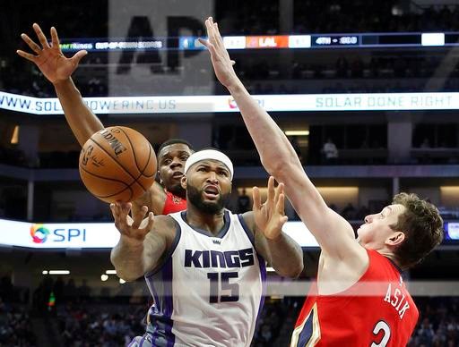 AP photo: The Sacramento Kings DeMarcus Cousins (15) drives to the basket past the New Orleans Pelicans Terrance Jones (left) and Omer Asik (3) in the second half of Tuesday night’s game at Golden 1 Center