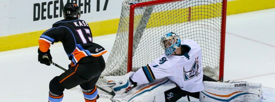 sjbarracuda.com photo: San Jose Barracuda goaltender Tony Grosenick defends the net against the San Diego Gulls on Friday night at Valley Casino Center in San Diego