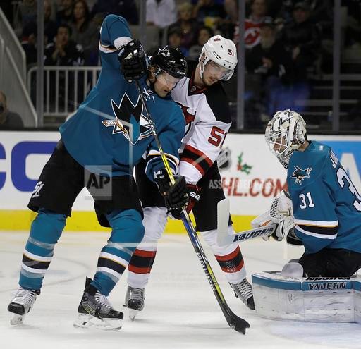AP photo: San Jose Sharks goaltender Martin Jones (31) in front of the net throws a shutout against the New Jersey Devils as the Devils Sergey Kalinin (51) and the Sharks Paul Martin tangle for the puck at SAP Center on Monday night