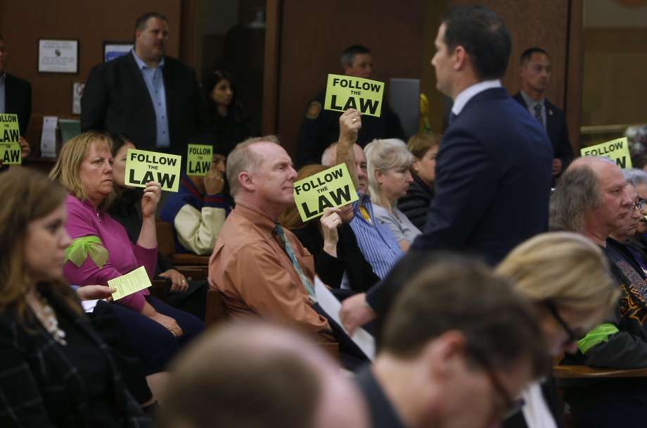 photo by scott strazantte San Francisco Chronicle: Santa Clara residents hold up a sign reminding San Francisco 49ers Business Operations President Al Guido to follow the law and hand over documents regarding what the Niners did with tax payer money on stadium operations or not