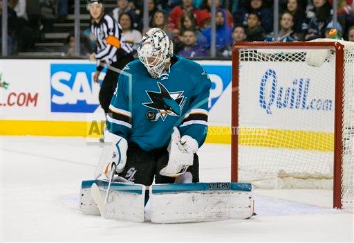 AP photo: San Jose Sharks goaltender Martin Jones (31) blocks one of the 33 shots he stopped on Wednesday night against the Chicago Blackhawks at SAP Center