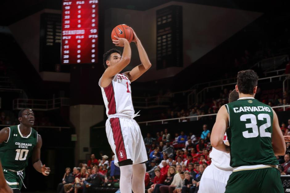 gostanford.com photo: Stanford Cardinal Dorian Pickens goes for a pair over Colorado State defenders, Pickens and teammate Reid Travis both finished on top in scoring with 19 on Friday night against Indiana State at the Advocare Invitational at HP Field House in Orlando Fla