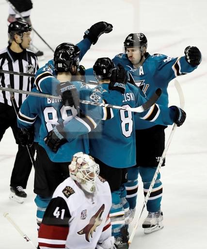 AP photo: San Jose Sharks Brent Burns is congratulated by his teammates after scoring the game winner past Arizona Coyote goalie Mike Smith in overtime Tuesday night at SAP Center