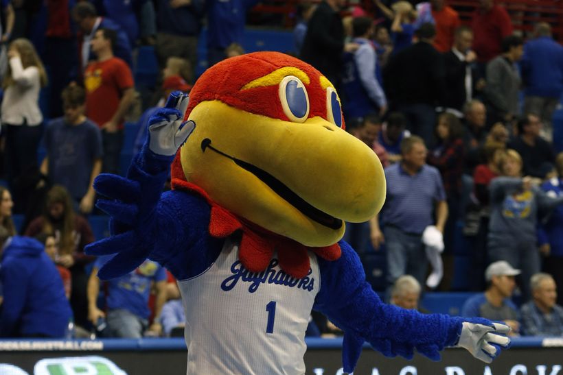 USA Today photo: The Kansas Jayhawks mascot gets the mood going at Allen Fieldhouse against the visiting Stanford Cardinal Saturday in one tough building to play ball in
