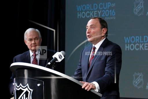 AP file photo: NHL Commissioner Gary Bettman (right) speaks to the media back on Jan 24th regarding the World Cup of Hockey with the NHL Executive Players Association Director Donald Fehr (left) in Toronto