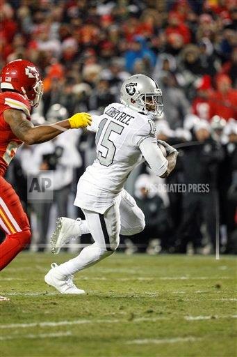 AP photo: Oakland Raiders wide receiver Michael Crabtree (15) runs on a reception against the Kansas City Chiefs during their NFL football game in Kansas City, Mo., Sunday, Oct. 23