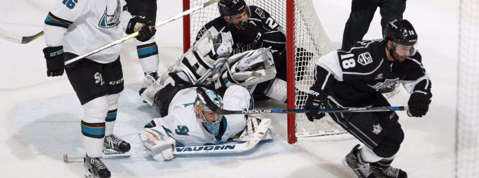 sjbarracuda.com photo: San Jose Barracuda goaltender Troy Grosenick takes to the icy floor to protect the net against the Ontario Reign on Saturday afternoon at SAP Center