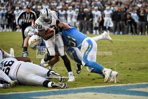 Oakland Raiders running back Latavius Murray (28) is held out of the end zone during the second half of an NFL football game against the San Diego Chargers Sunday, Dec. 18, 2016, in San Diego. (AP Photo/Denis Poroy)