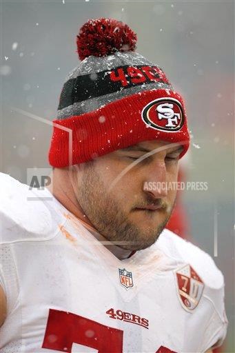 San Francisco 49ers offensive tackle Joe Staley (74) looks on from the sidelines during a week 13 NFL football game against the Chicago Bears, Sunday, Dec. 4, 2016, in Chicago. The Bears won 26-6. (Scott Boehm via AP)
