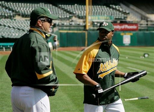 Oakland Athletics new outfielder Rajai Davis, right, talks with manager Bob Geren, left, during batting practice before their baseball game against the Minnesota Twins in Oakland, Calif., Thursday, April 24, 2008. Davis was picked up by the A’s this week after playing for Cleveland last season. (AP Photo/Eric Risberg)
