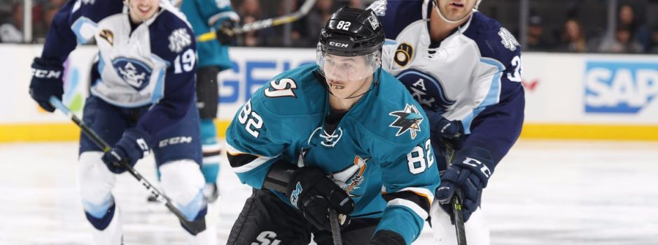 sjbarracuda.com photo: Nikolay Goldobin forward (82) of the San Jose Barracuda is pursued by the Milwaukee Admirals Justin Florek left winger (38) and Justin Kirkland left wing (19)