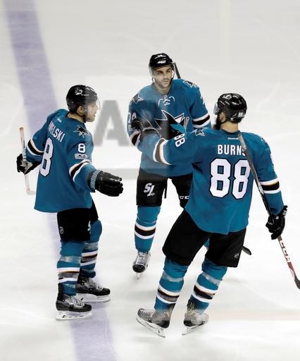 San Jose Sharks’ Joe Pavelski, left, celebrates his goal with teammates Dylan DeMelo, center, and Brent Burns (88) during the third period of an NHL hockey game against the Detroit Red Wings Saturday, Jan. 7, 2017, in San Jose, Calif. (AP Photo/Marcio Jose Sanchez)