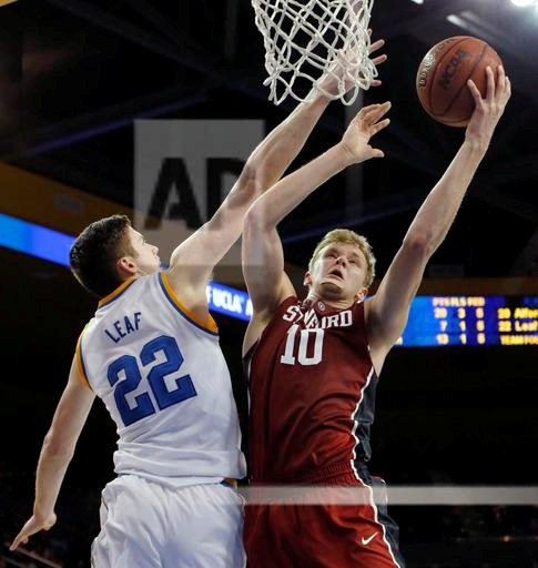 UCLA forward TJ Leaf (22) defends as Stanford forward Michael Humphrey (10) shoots in the first half of an NCAA college basketball game in Los Angeles on Sunday, Jan. 8, 2017. UCLA won, 89-75. (AP Photo/Reed Saxon)