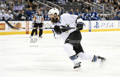 San Jose Sharks defenceman Brett Burns (88) takes a shot against Toronto Maple Leafs during the second period at Air Canada Centre in Toronto, ON, Canada. Burns scored the winning goal in overtime to give the Sharks a 5-4 win. (Photo by Dan Hamilton/Icon Sportswire) (Icon Sportswire via AP Images)