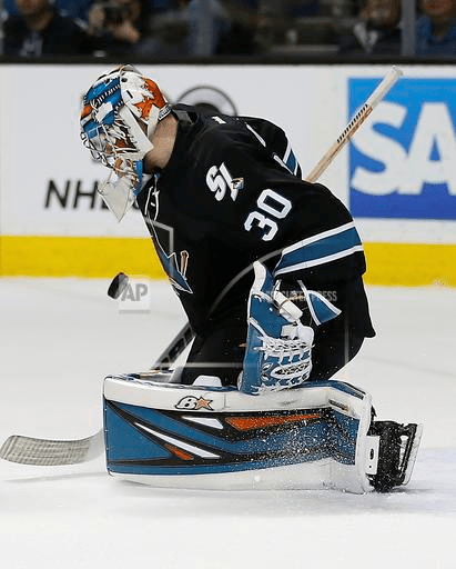 San Jose Sharks goalie Aaron Dell deflects a shot on goal by the Tampa Bay Lightning during the second period of an NHL hockey game, Thursday, Jan. 19, 2017, in San Jose, Calif. (AP Photo/Tony Avelar)