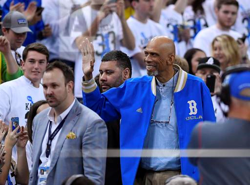 Kareem Abdul-Jabbar waves to fans as he walks to his seat prior to an NCAA college basketball game between UCLA and Arizona, Saturday, Jan. 21, 2017, in Los Angeles. Abdul-Jabbar was honored at halftime during a ceremony to celebrate Kareem Abdul-Jabbar day at UCLA. (AP Photo/Mark J. Terrill)