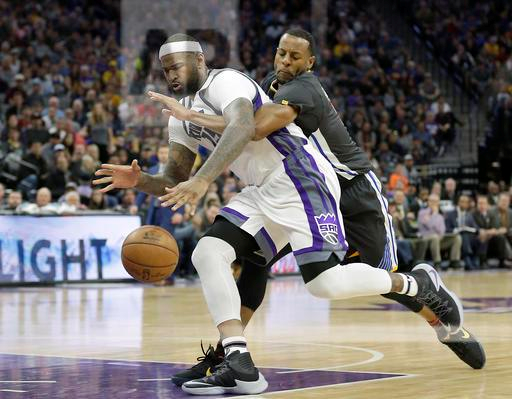 Sacramento Kings forward DeMarcus Cousins, left, and Golden State Warriors forward Andre Iguodala scramble after the ball during the second half of an NBA basketball game Saturday, Feb. 4, 2017, in Sacramento, Calif. The Kings won in overtime 109-106. (AP Photo/Rich Pedroncelli)
