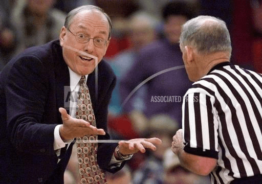 Syracuse coach Jim Boheim, left, argues with referee John Clougherty over a call during the first half against Providence College at the Providence Civic Center in Providence, R.I., Saturday, Feb. 5, 2000. Syracuse beat Providence College, 74-58. (AP file Photo/ Victoria Arocho)