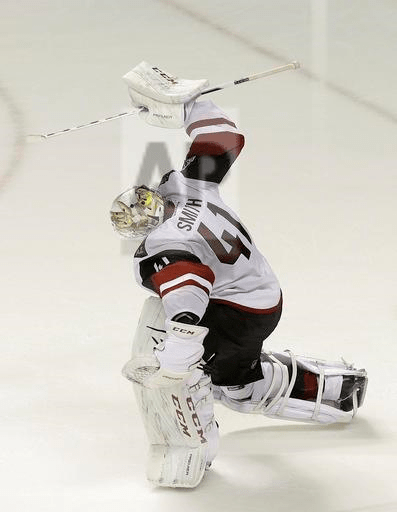 Arizona Coyotes goalie Mike Smith (41) celebrates after the Coyotes beat the San Jose Sharks in an NHL hockey game in San Jose, Calif., Saturday, Feb. 4, 2017. The Coyotes won in a shootout, 3-2. (AP Photo/Jeff Chiu