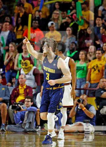 California guard Grant Mullins (3) points to a teammate after hitting a 3-pointer against Arizona State during the second half of an NCAA college basketball game Wednesday, Feb. 8, 2017, in Tempe, Ariz. California defeated Arizona State 68-43. (AP Photo/Ross D. Franklin)
