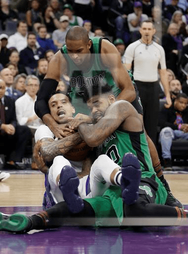 Sacramento Kings forward Matt Barnes, left, battles Boston Celtics center Al Horford, center, and Boston Celtics forward Amir Johnson for the ball during the first half of an NBA basketball game, Wednesday, Feb. 8, 2017, in Sacramento, Calif. (AP Photo/Rich Pedroncelli)