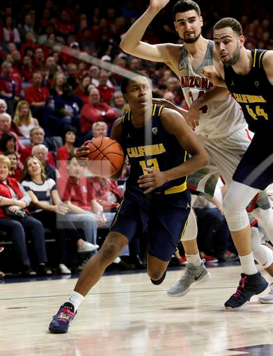 California guard Charlie Moore (13) drives past teammate Kameron Rooks (44) and Arizona center Dusan Ristic during the first half of an NCAA college basketball game, Saturday, Feb. 11, 2017, in Tucson, Ariz. (AP Photo/Rick Scuteri)