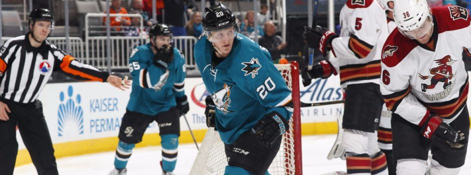 sjbarracuda.com photo: San Jose Barracuda forward Marcus Sorenson (20) skates behind the net during a break in the action against the Tucson Roadrunners at SAP Center on Tuesday night