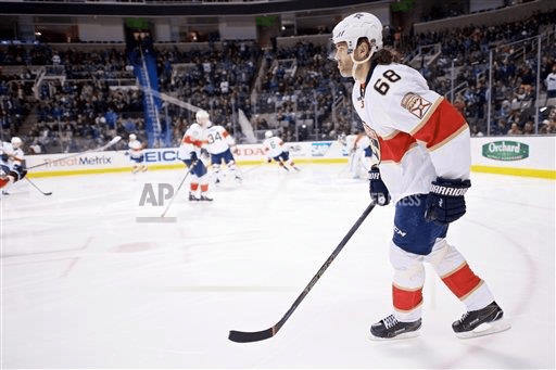 SAN JOSE–The Florida Panthers gave Jaromir Jagr a pretty decent 45th birthday present. The Cats beat the San Jose Sharks 6-5 in overtime Wednesday night, with Jonathan Huberdeau netting the game-winner1:38 into the extra session. Brent Burns scored his team-leading 25th goal and Joe Pavelski had a four-point night to help erase a 3-1 and 5-3 deficit, giving the Sharks the loser point with an OT loss. Aleksander Barkov and Nick Bjugstad each scored a pair of goals for Florida.