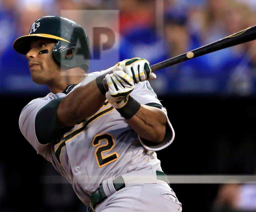 In this Sept. 15, 2016, file photo, Oakland Athletics’ Khris Davis hits a two-run double off Kansas City Royals starting pitcher Edinson Volquez during the fourth inning of a baseball game at Kauffman Stadium in Kansas City, Mo. Davis has asked an arbitration panel for a $5 million salary this season, and the Oakland Athletics argued the outfielder should be paid $4.65 million. The sides appeared Tuesday, Jan. 31, 2017, before arbitrators Mark Irvings, Gil Vernon, Mark Burstein, who are expected to issue their decision Wednesday. (AP Photo/Orlin Wagner, File)