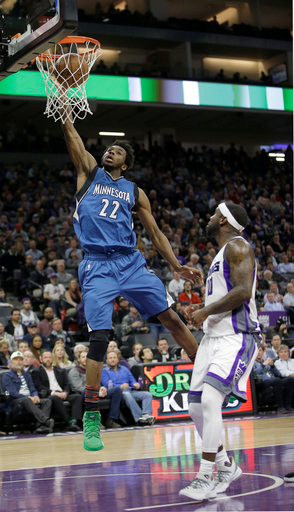 Minnesota Timberwolves forward Andrew Wiggins, left, stuffs as Sacramento Kings guard Ty Lawson looks on during the first half of an NBA basketball game Monday, Feb. 27, 2017, in Sacramento, Calif. (AP Photo/Rich Pedroncelli)
